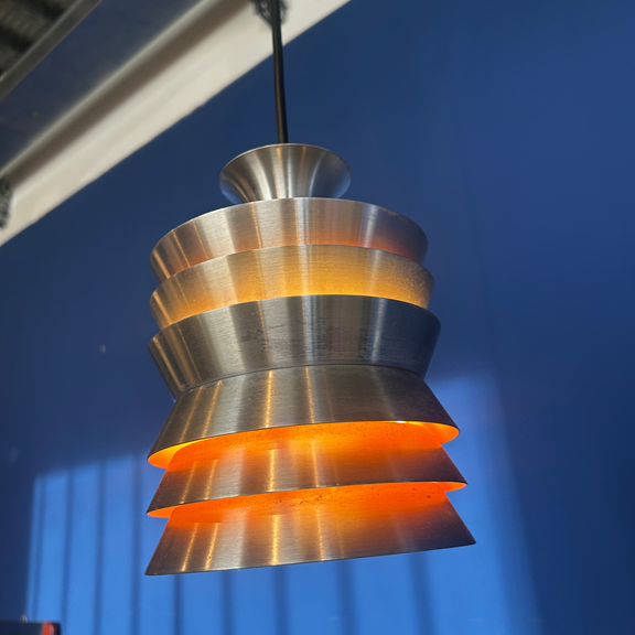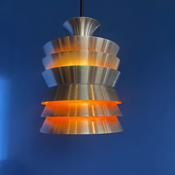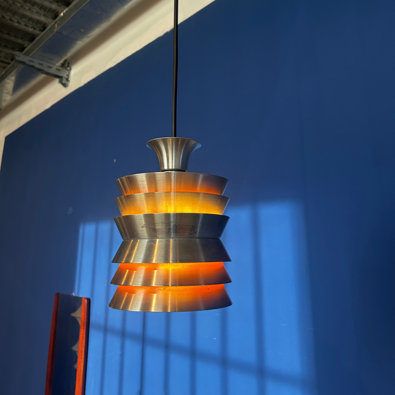 Aggiungi un'icona del design scandinavo ai tuoi interni con la lampada a sospensione Trava, il progetto più celebre di Carl Thore (pseudonimo di Sigurd Lindkvist) per la manifattura svedese Granhaga Metallindustri. Il nome "Trava" significa letteralmente "pila" o "catasta", un chiaro riferimento alla geniale struttura a dischi sovrapposti che caratterizza questo pezzo di modernariato.