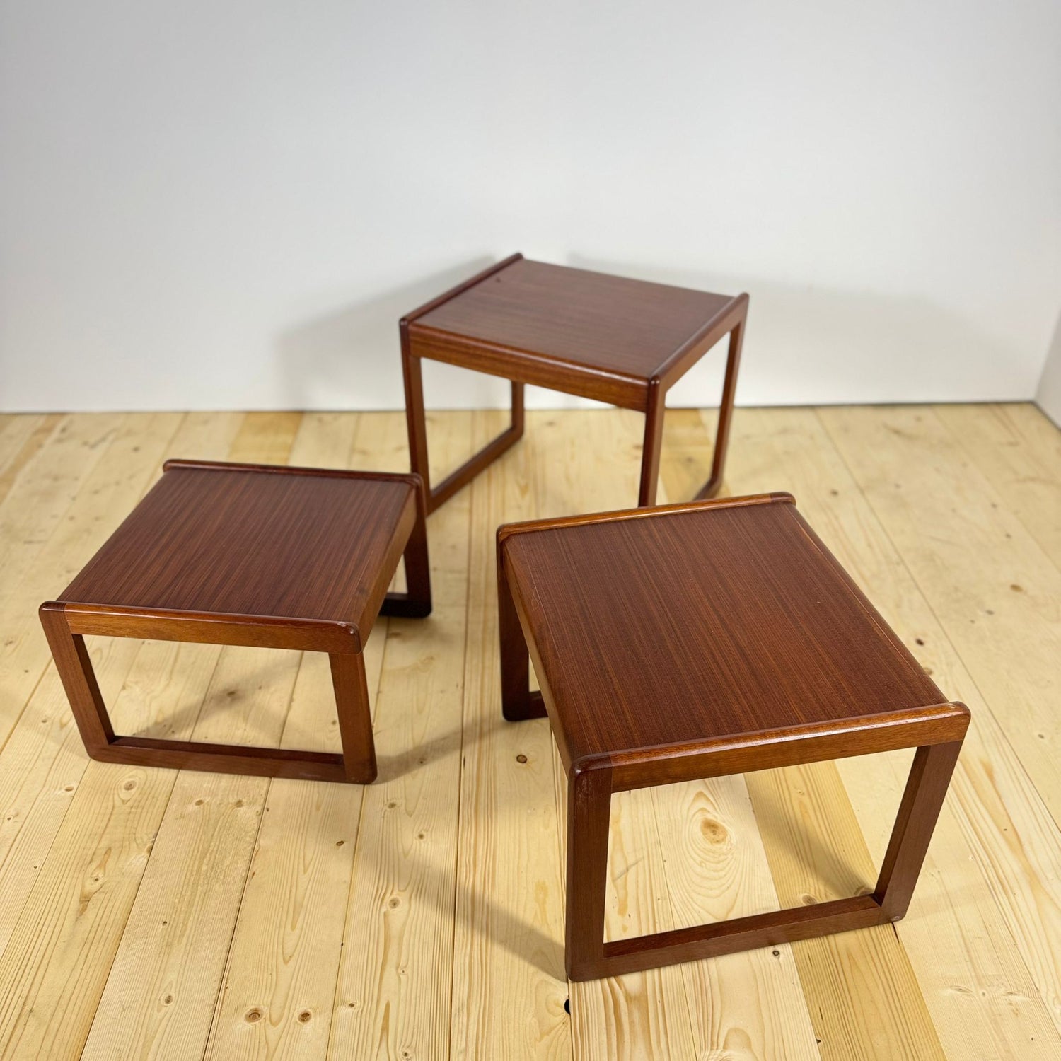 Tre tavolini in teak che si incastrano perfettamente: il design danese degli anni Sessanta che gioca con lo spazio! Realizzati in teak caldo e luminoso, questi piccoli capolavori scandinavian si trasformano a piacere—impilati per risparmiare spazio o disposti singolarmente per moltiplicare le superfici. Minimalisti, versatili e pieni di carattere vintage. Un tocco di eleganza retrò che non passa mai di moda.