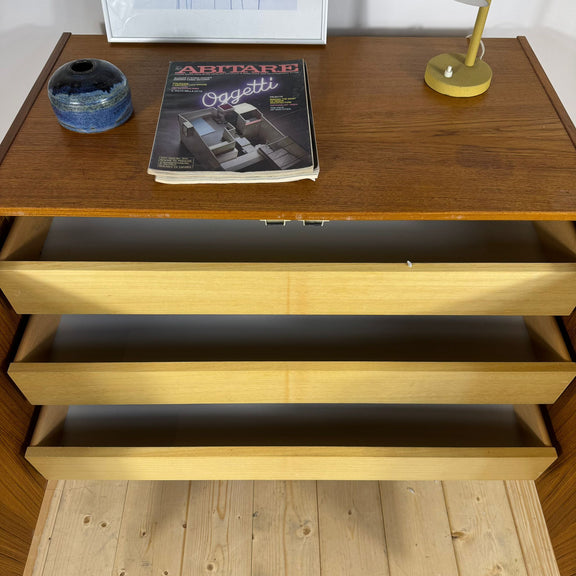 Sideboard autentico Mid-Century Modern, realizzato in teak, legno iconico del design scandinavo per la sua venatura calda e la straordinaria durata nel tempo. Il mobile si distingue per la sua capacità di unire estetica e funzionalità: una struttura sobria e lineare che nasconde cassetti interni, pensati per conservare oggetti con ordine e discrezione. Questo dettaglio testimonia l’attenzione progettuale tipica dell’epoca, dove la bellezza nasce dalla cura dei particolari e dalla pulizia delle proporzioni. Ideale per un living elegante o una sala da pranzo di alto livello, il sideboard si integra perfettamente in contesti contemporanei, offrendo una presenza sofisticata senza mai risultare invadente. Un pezzo raro di Arredamento Vintage Originale, destinato a collezionisti e appassionati del Design Mid-Century.