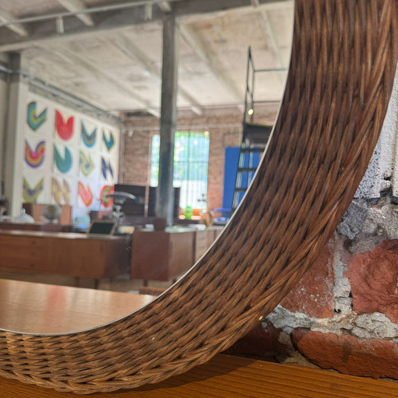 Specchio rotondo danese del 1960 con cornice intrecciata in vimini naturale. Questo accessorio Mid-Century combina la semplicità geometrica con la texture organica del materiale, creando un pezzo che dialoga perfettamente con interni contemporanei e vintage. La lavorazione artigianale della cornice e la forma circolare pura riflettono l'estetica scandinava autentica. Un complemento d'arredo versatile che aggiunge calore e carattere, ideale per chi ricerca design originale con qualità costruttiva genuina.