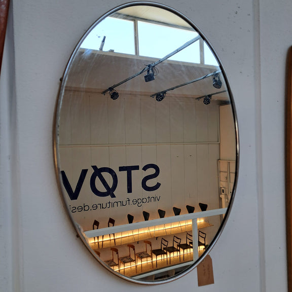 Specchio ovale vintage con cornice cromata, un pezzo retrò che unisce eleganza e modernità. La forma sinuosa e la finitura metallica lucida creano un accessorio versatile, perfetto per interni contemporanei e vintage. La cornice cromata conferisce un tocco sofisticato e minimalista, caratteristico del design Mid-Century. Ideale per chi ricerca complementi d'arredo originali che combinano funzionalità e stile, aggiungendo carattere e luminosità agli ambienti con qualità costruttiva autentica.